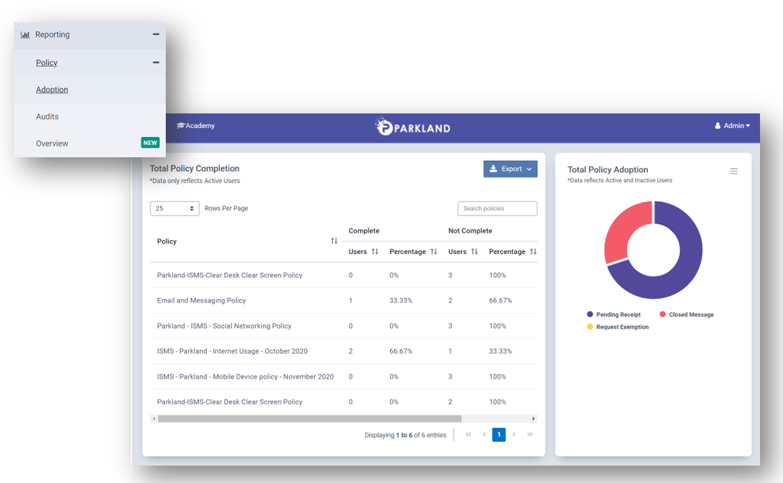 This Report presents the Completion levels for all published Policies, helping you to view at a glance, the adoption rates for all Policies within one table. You can also export the Report and Chart as required.