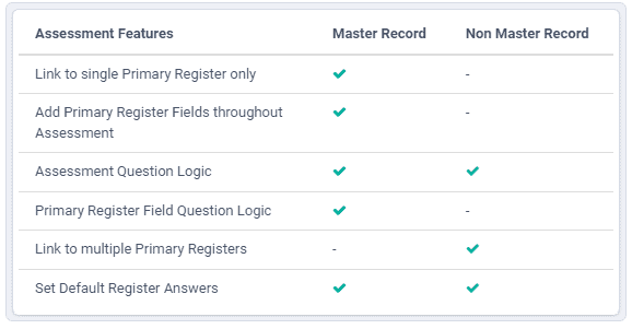 Les évaluations des fiches maîtresses peuvent être utilisées pour des évaluations de base à deux niveaux. Les registres connexes utilisés dans l’évaluation seront directement liés au registre principal.