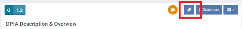 Les évaluateurs de la protection de la vie privée peuvent désormais consulter les enregistrements de preuves et les documents joints ou les URL dans toutes les questions pertinentes de l’évaluation de la protection de la vie privée. Vous pouvez y accéder en cliquant sur l’icône représentant un trombone sur chaque question.