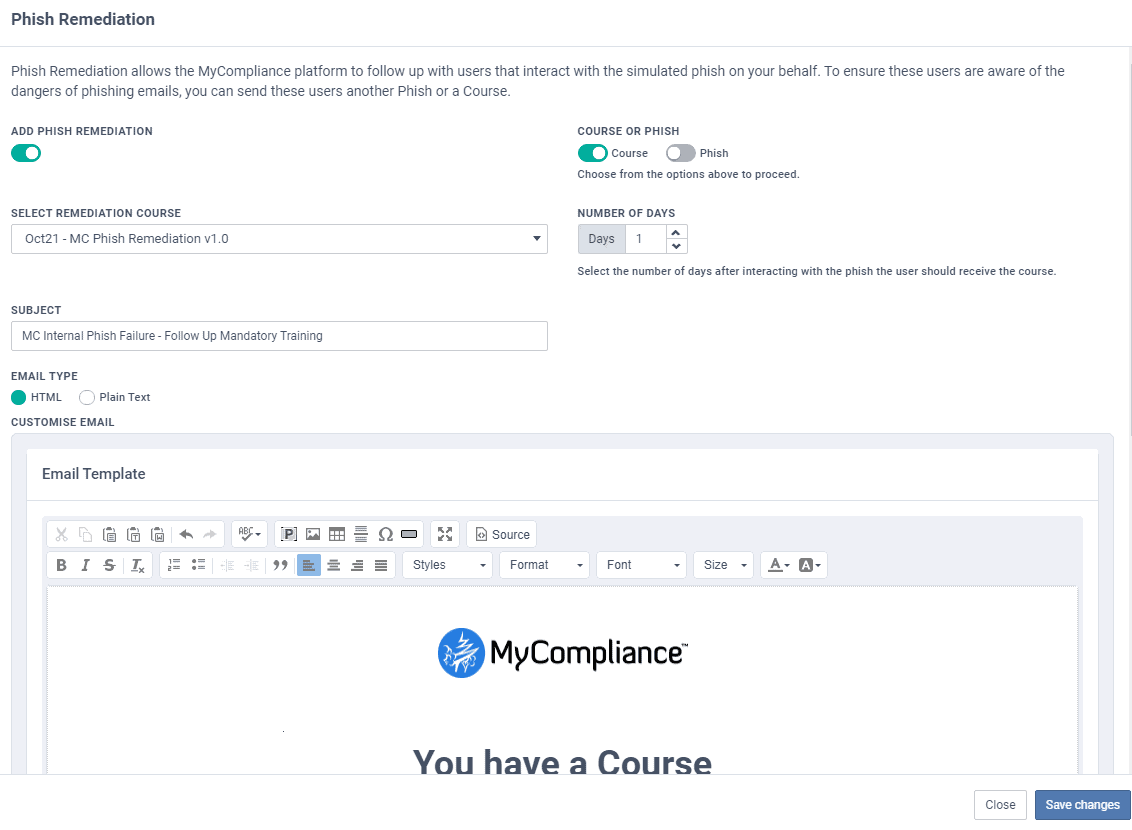 Esta última funcionalidade das Campanhas permitirá que o sistema faça o acompanhamento de quaisquer Phish Clickers em teu nome. Este acompanhamento pode assumir a forma de outro e-mail de Phishing ou de um curso de eLearning com uma notificação por e-mail personalizada – ambos ajudarão a garantir que o teu pessoal permanece online e a reduzir o risco de um ataque real à tua organização.