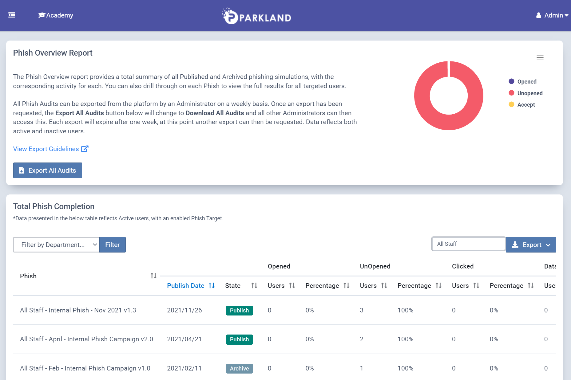 The Phish, Course, Policy & Survey Overview reports have been updated to enable the new Export action. A full export can now be requested for each module, by an Administrator once a week. This report will contain all audits, with all related data available. View More.